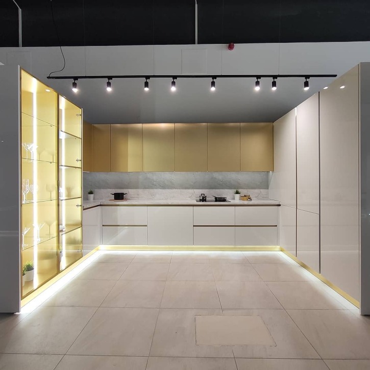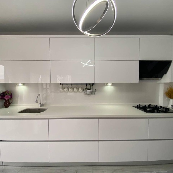 سطح براق هایگلاس نور محیط را به خوبی بازتاب میدهد و باعث میشود آشپزخانه بزرگتر و روشنتر دیده شود؛ مخصوصاً در آپارتمانهای کوچک و آشپزخانههای کمنور، این مزیت کاملاً محسوس است.
