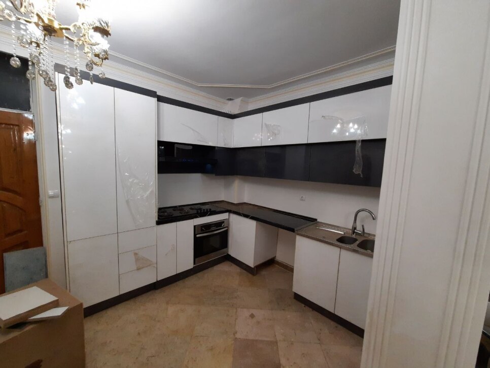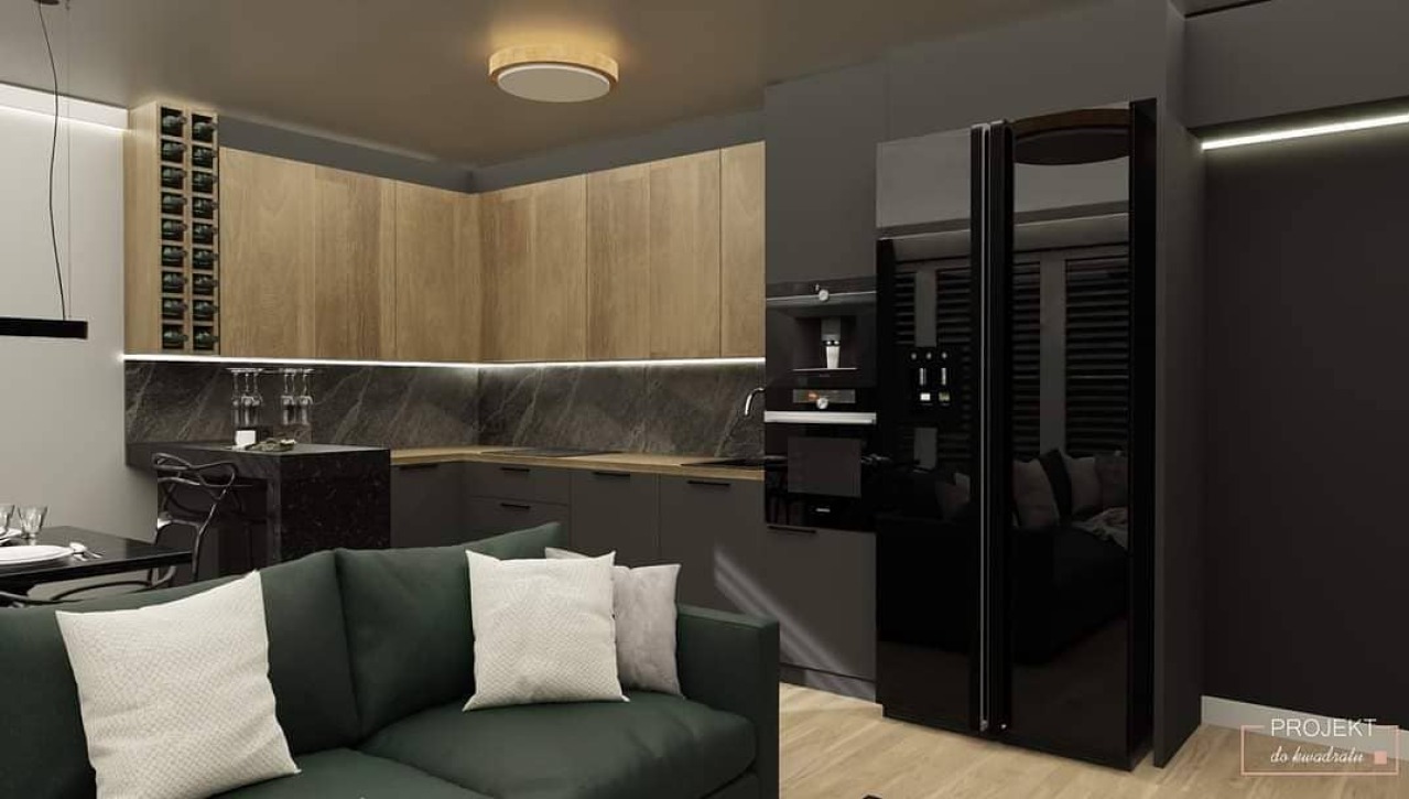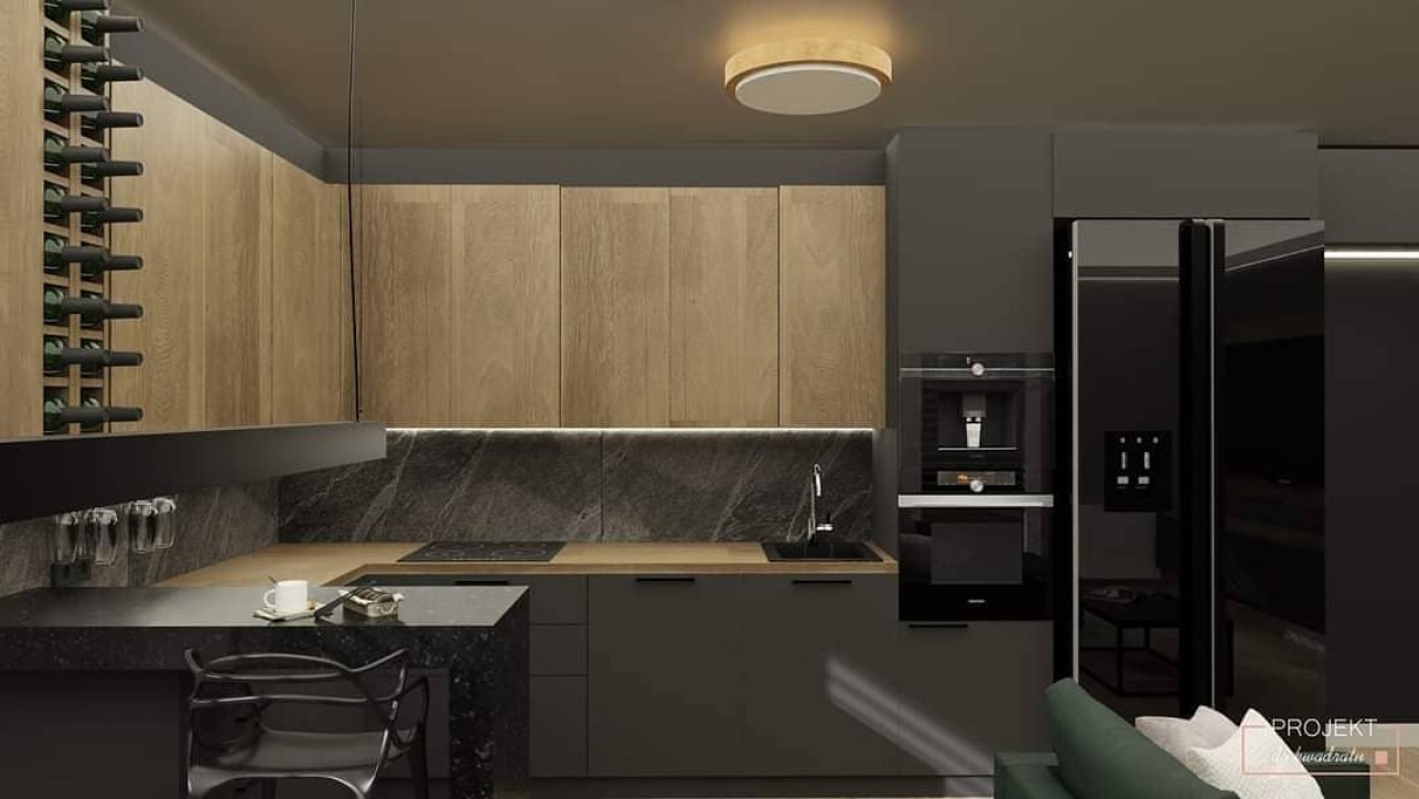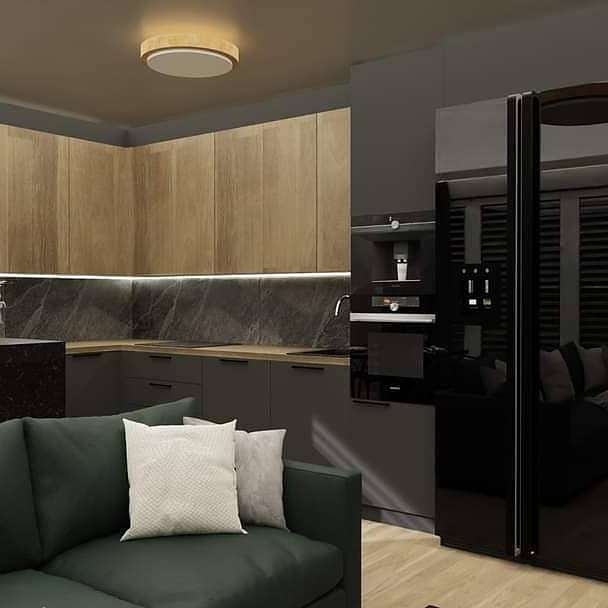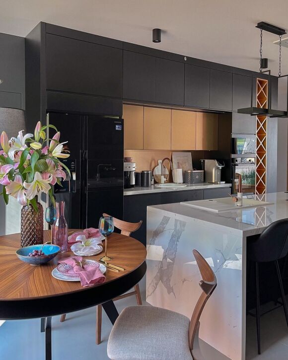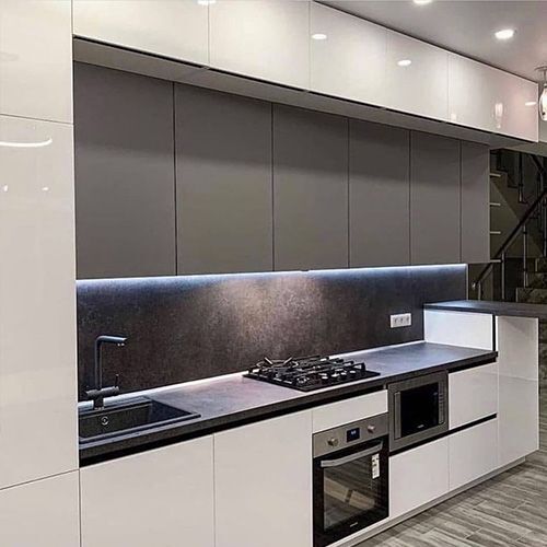 استفاده از رنگهای تیره، ترکیب با سنگهای روشن روی صفحه کابینت و نور مخفی زیر کابینتها، فضایی بسیار چشمگیر و لاکچری میسازد.